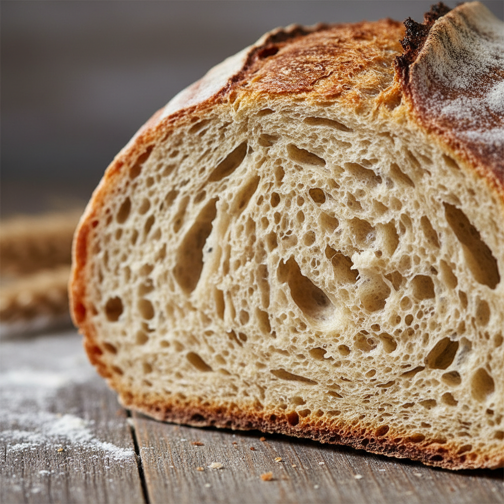 - Przekrój bochenek: Zwróć uwagę na nieregularne pory i elastyczny, lekko wilgotny miąższ.