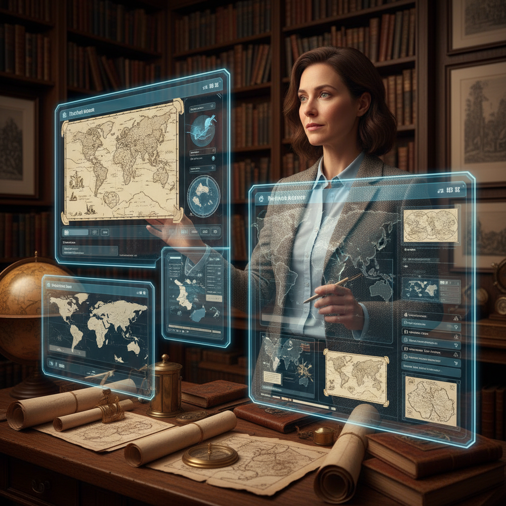 Osoba porównująca stare mapy z ekranem komputera – tak wygląda praca nowoczesnego poszukiwacza zabytków